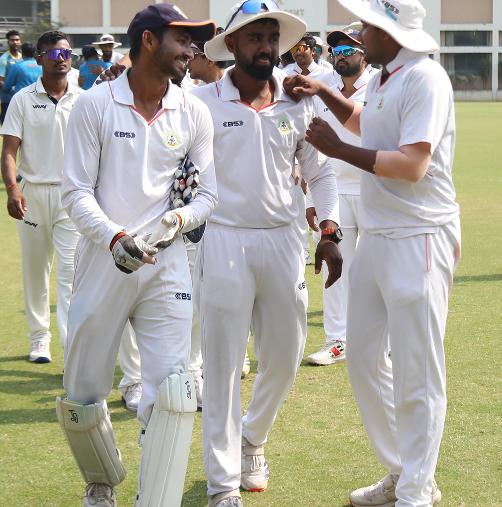 Vidarbha captain Akshay Wadkar (left) leads his team back to the pavilion after beating MP by 62 runs in the semi-final of the Ranji Trophy, played at the VCA’s Civil Lines Stadium from March 2-6, 2024