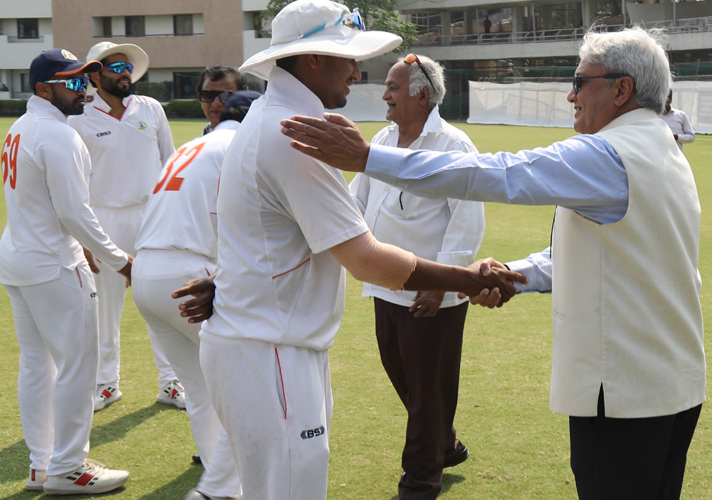VCA President Justice Vinay M. Deshpande (former judge of the Bombay High Court) greets Vidarbha players after their fabulous victory over MP in the semi-final of the Ranji Trophy, played at the VCA’s Civil Lines Stadium from March 2-6, 2024