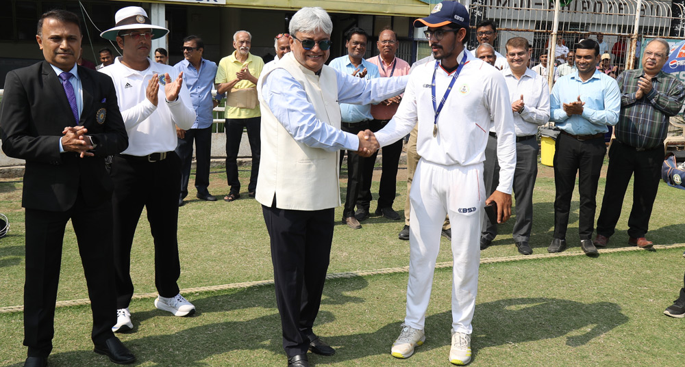 VCA President Justice Vinay M. Deshpande (former judge of the Bombay High Court) presents the Player of the Match medal to Vidarbha’s Yash Rathod following their victory over MP in the semi-final of the Ranji Trophy, played at the VCA’s Civil Lines Stadium from March 2-6, 2024