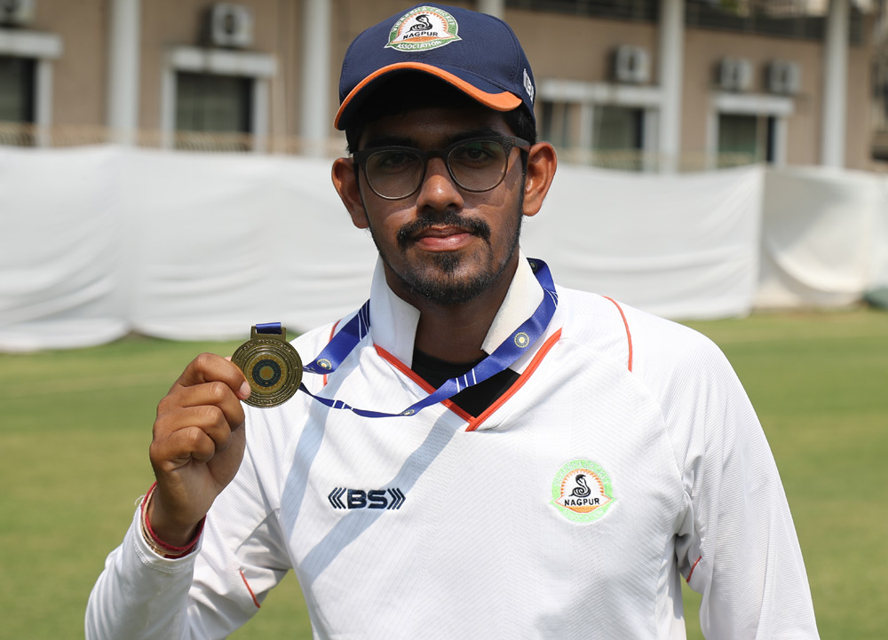 Vidarbha batsman Yash Rathod, who scored a magnificent century (141) in the second innings against MP in the semi-final of the Ranji Trophy 2023-24, shows off his Player of the Match medal