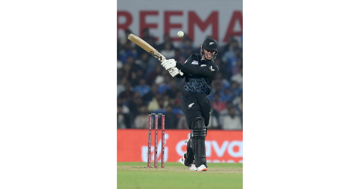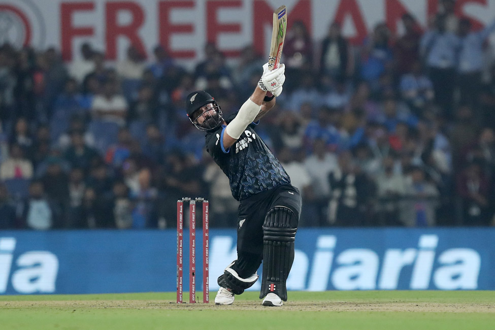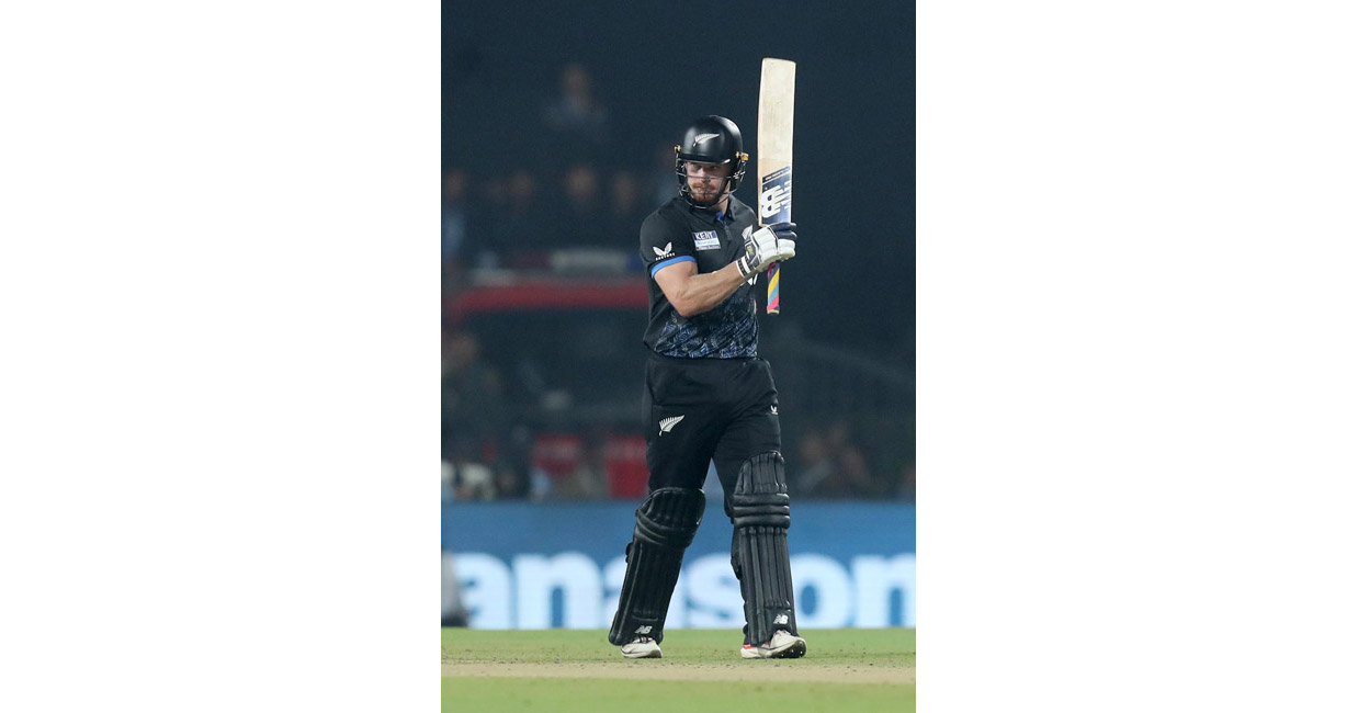 New Zealand’s top-scorer Glenn Phillips celebrates after reaching his half-century
