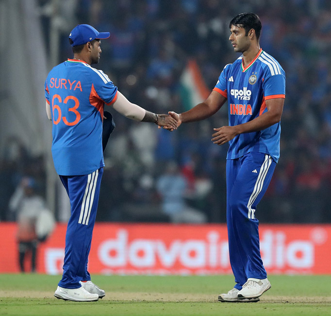Indian pacer Arshdeep Singh celebrates after dismissing Devon Conway