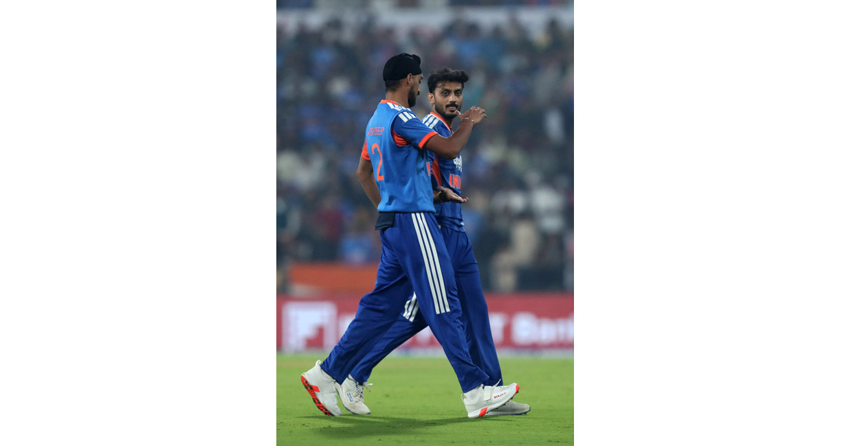 Arshdeep Singh congratulates Axar Patel after the latter dismissed Glenn Phillips