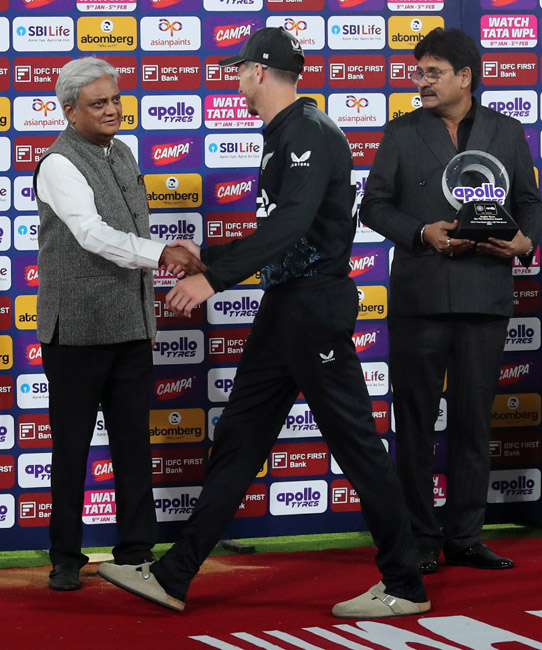 VCA President, Justice Vinay Deshpande (Retd) shakes hand with NZ skipper Santner