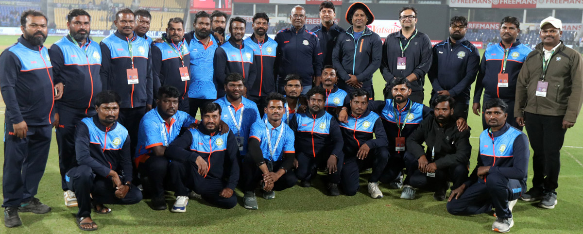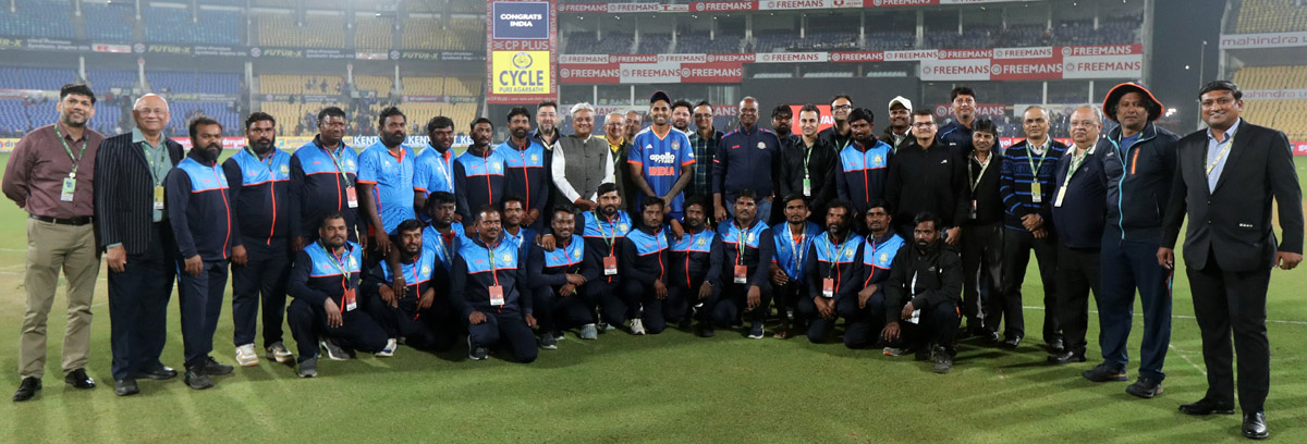 India captain Suryakumar Yadav poses with VCA curators, groundsmen and officials after the match